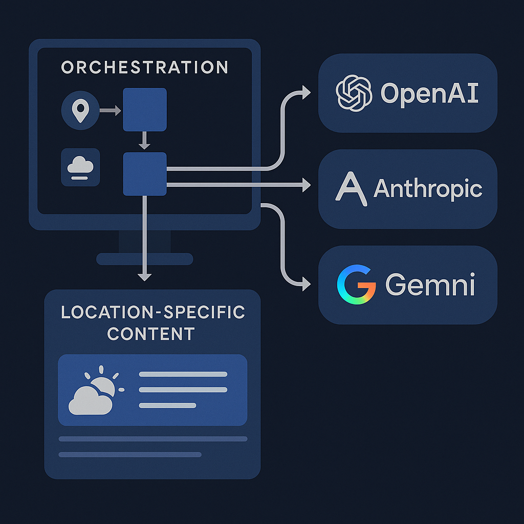 In today's rapidly evolving AI landscape, creating systems that can leverage multiple large language models (LLMs) while integrating real-time data has become a powerful approach for developing context-aware applications. In this post, I'll walk through a system I built that orchestrates various AI models to generate location-specific content with a focus on weather forecasts and local information.